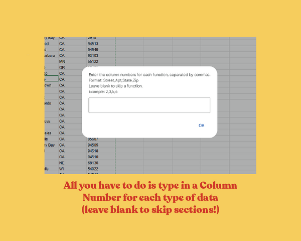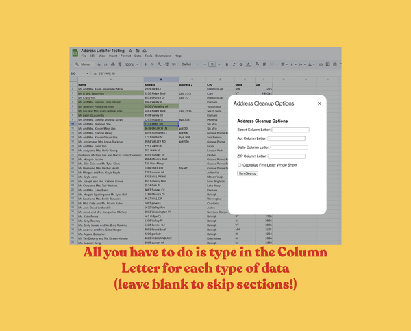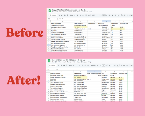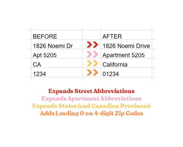 Address Cleanup turns messy, inconsistent address lists in Google Sheets into consistent, properly-formatted address lists in just a few clicks!